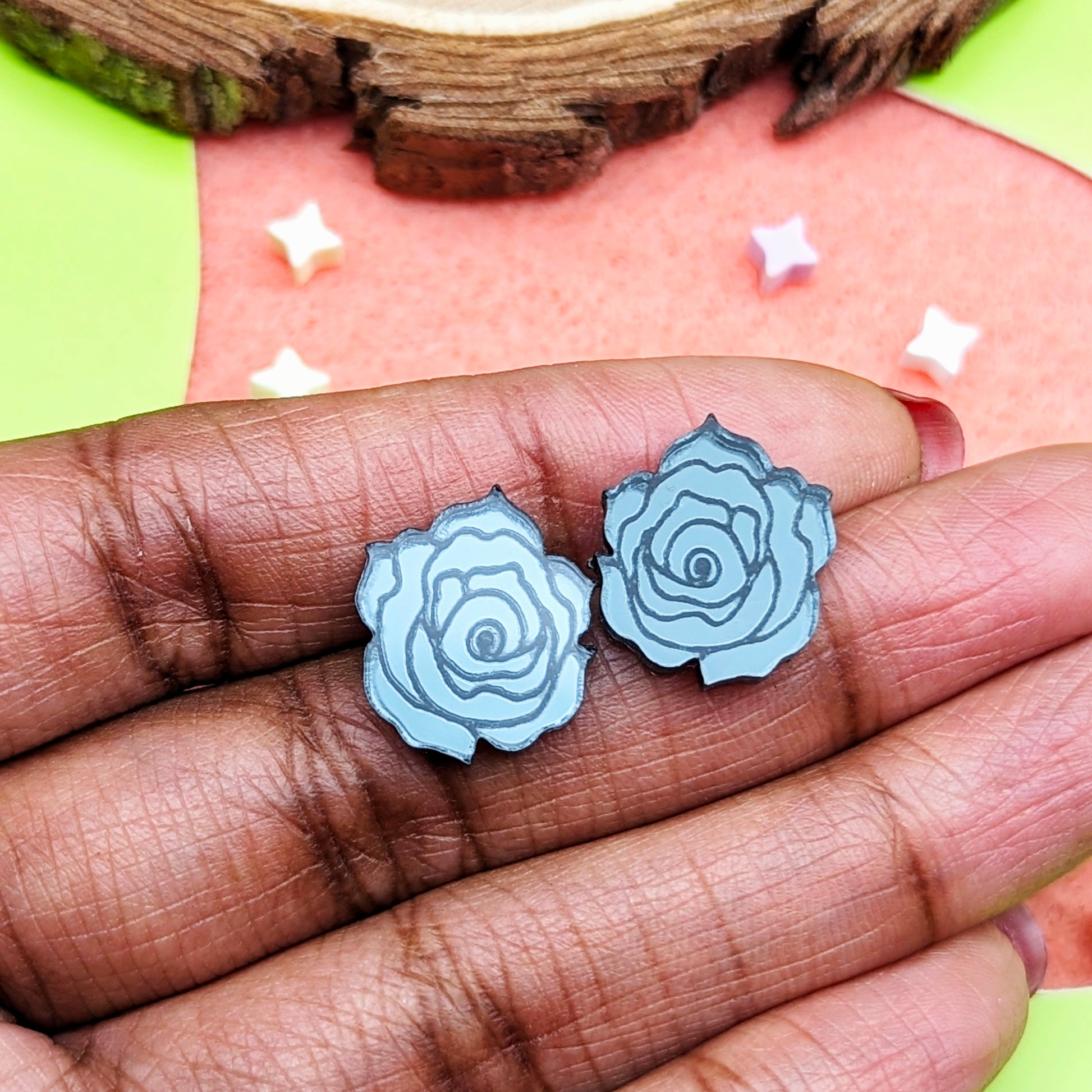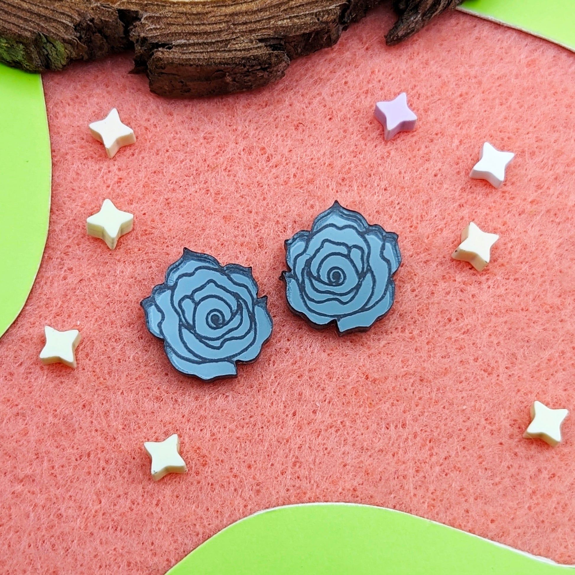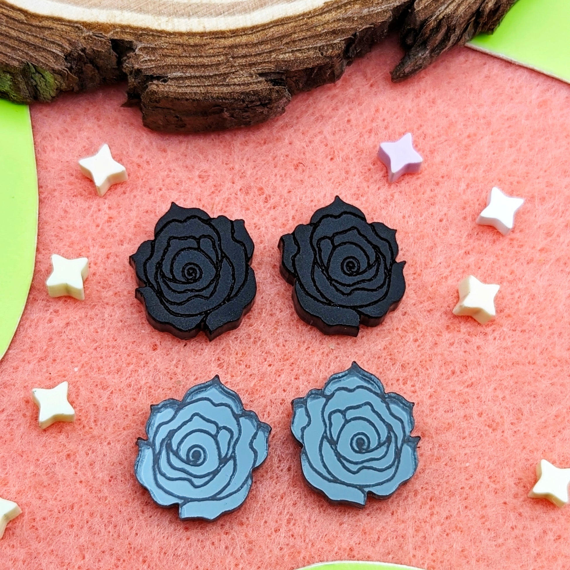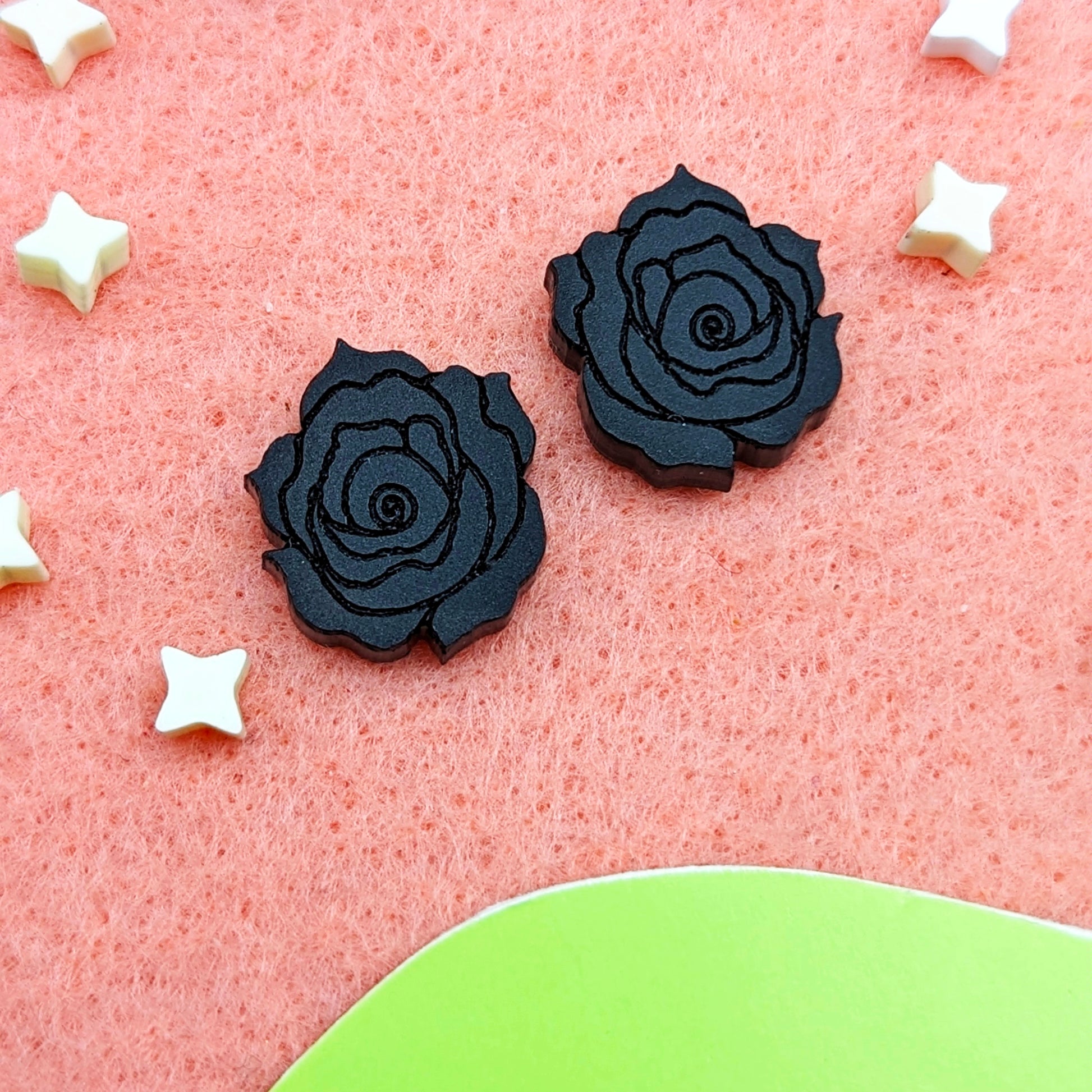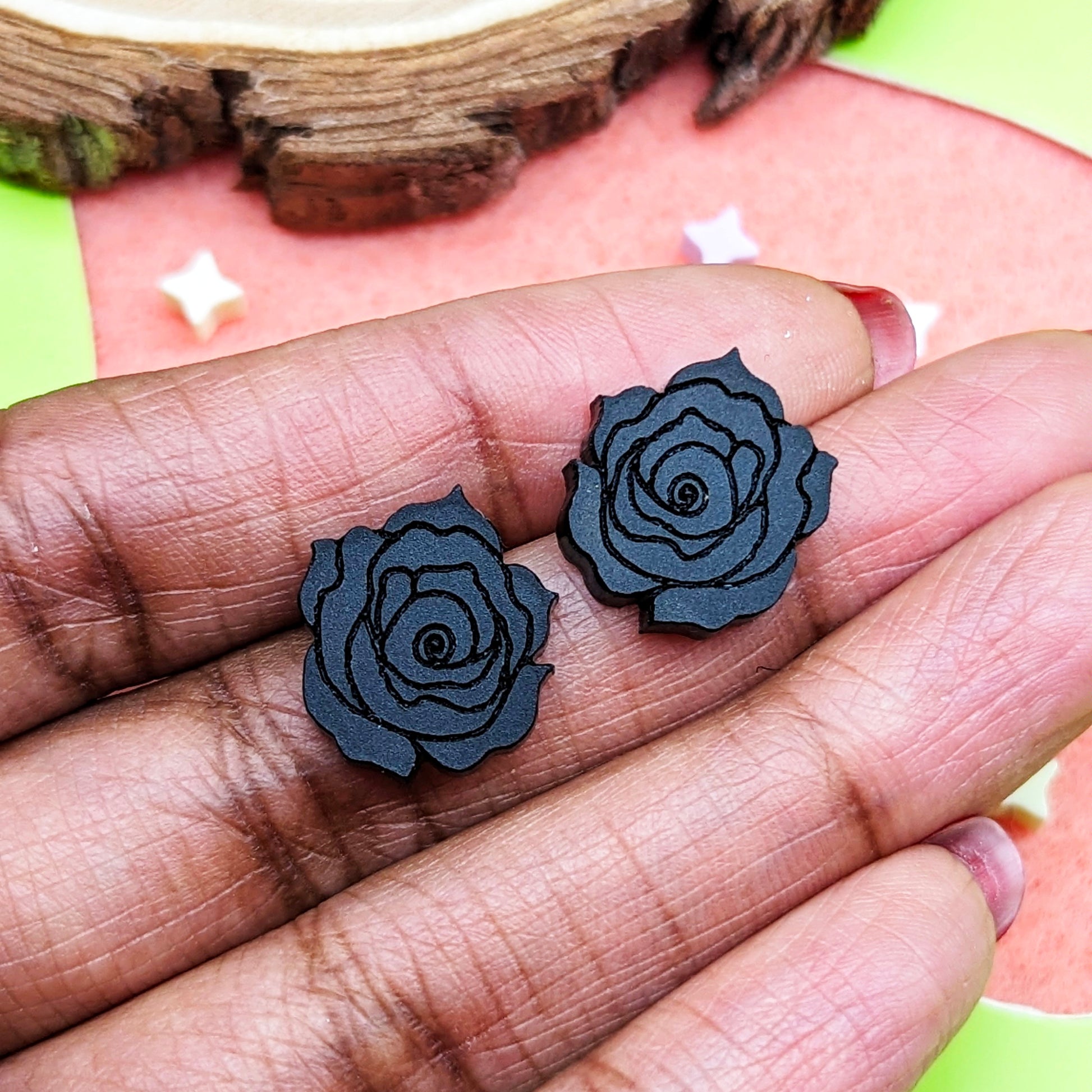 Black Rose-shaped Stud Earrings with engraved details. Choose Matte or Shiny.