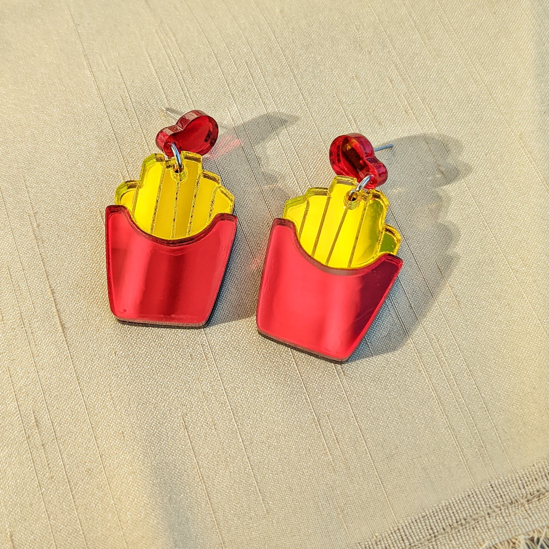 Yummy salty French Fry earrings in an iconic red container. They are shiny and reflective to add a little extra sparkle to your life.