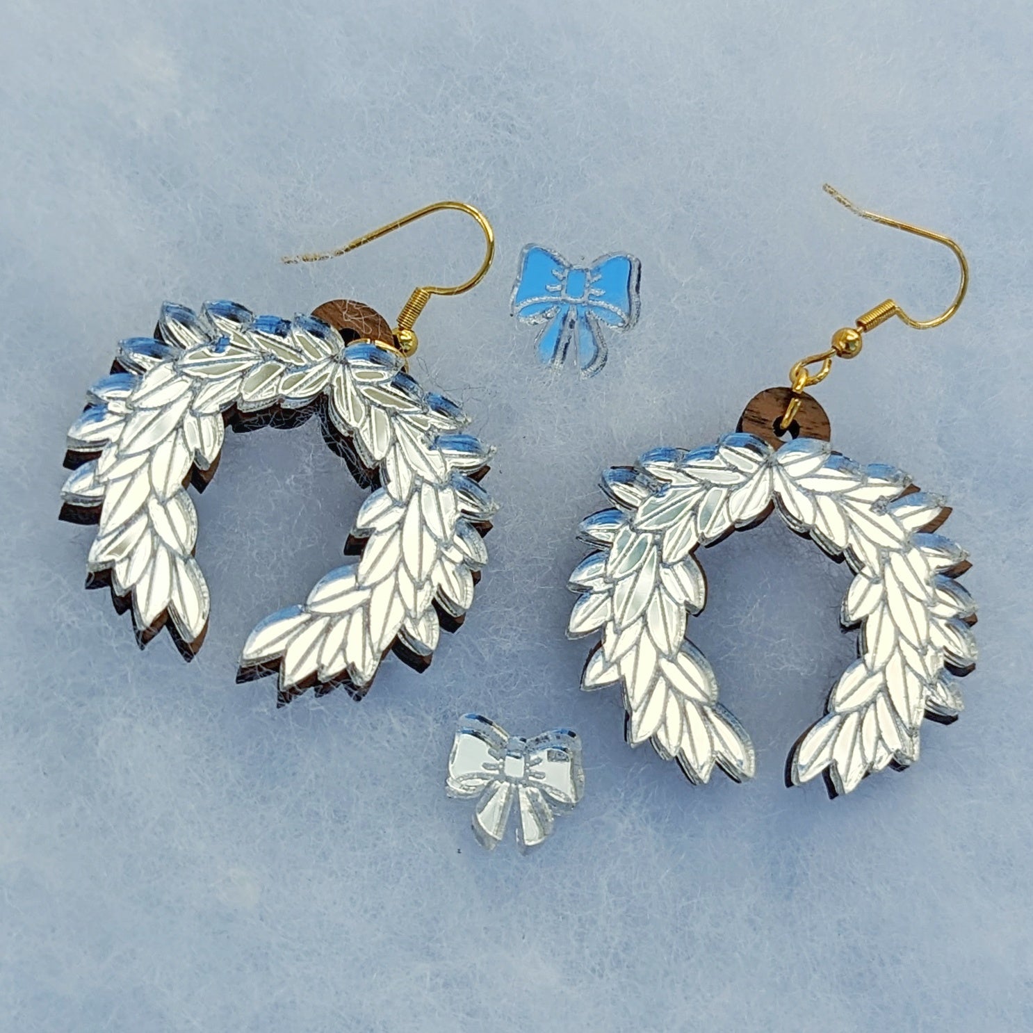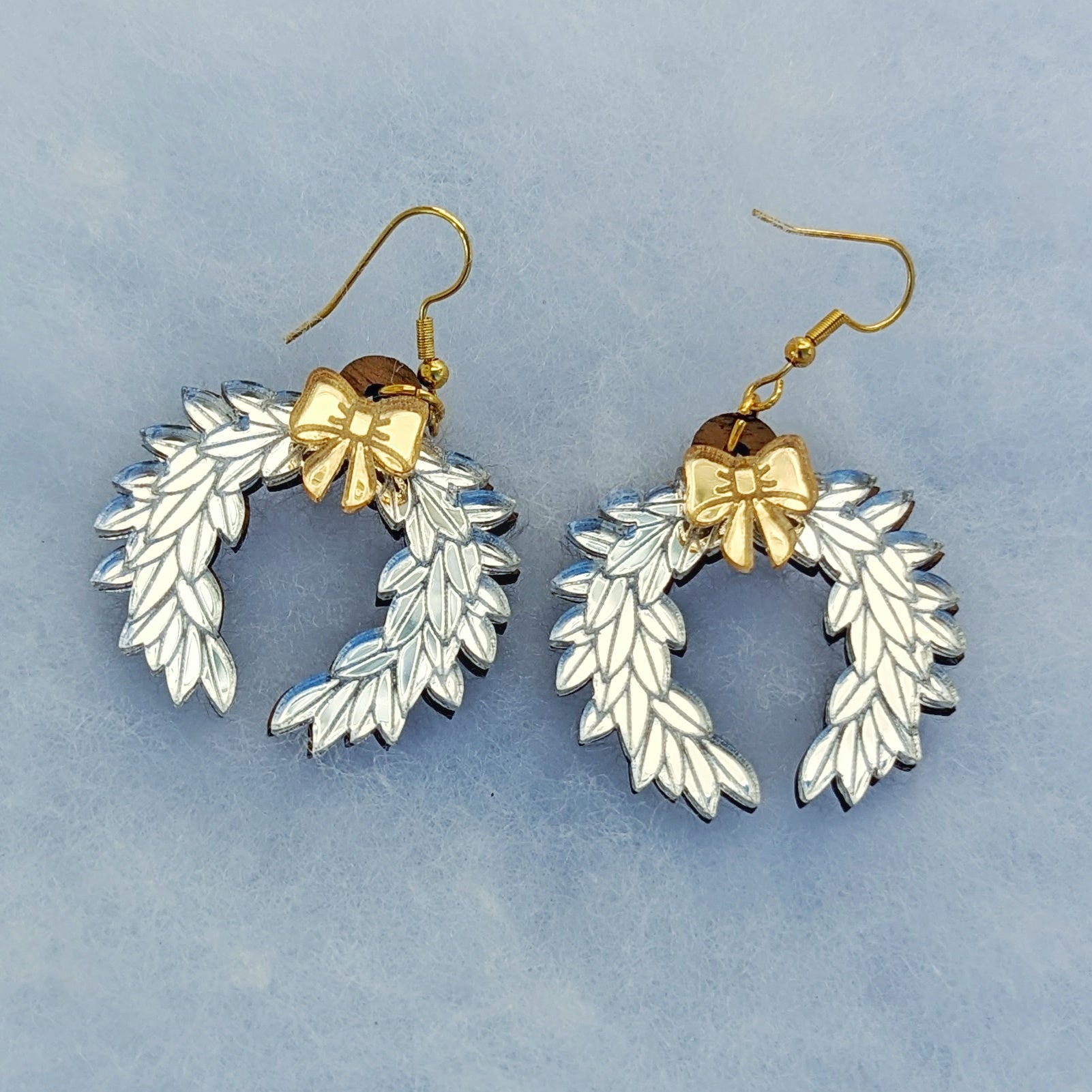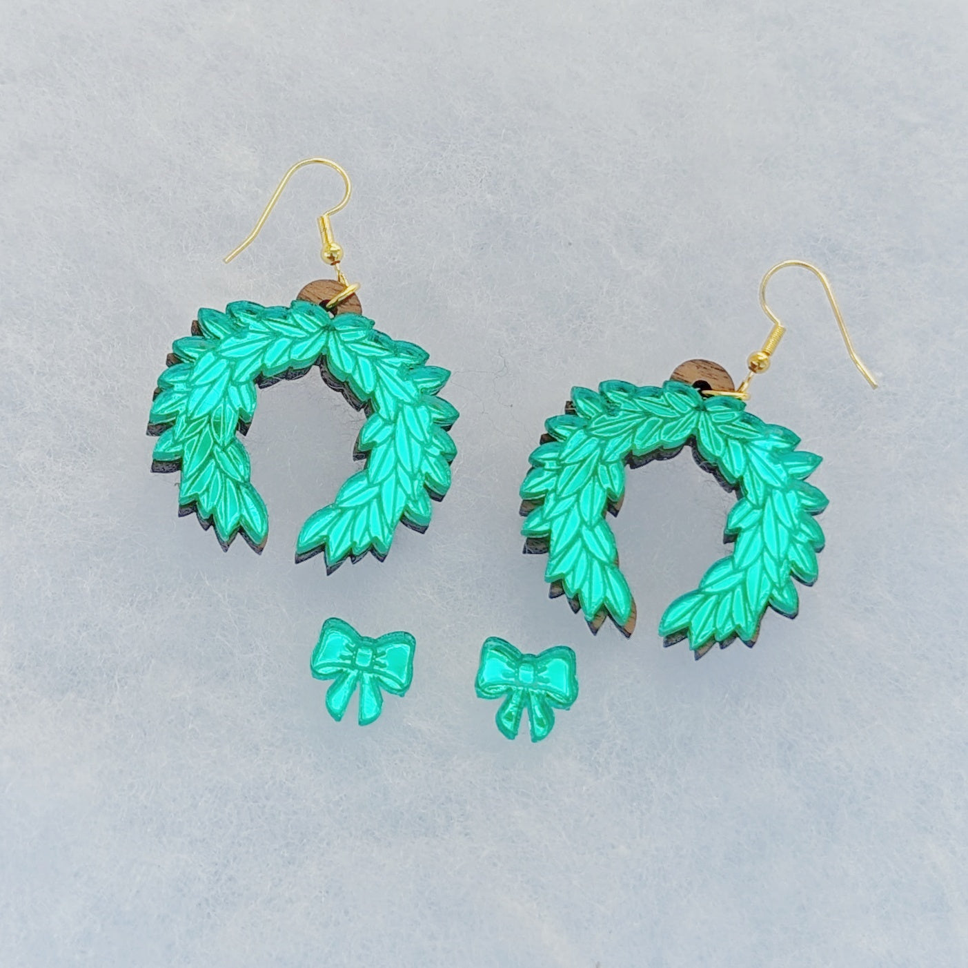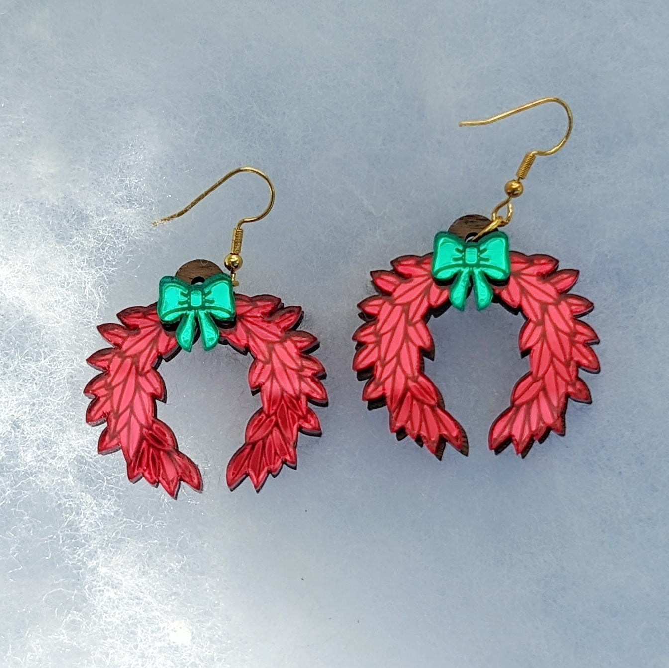 Holiday Laurel Wreath Earrings come in a variety of colors. Choose from Red, Green, Silver, Gold or Multi. Multi is a combination of Green, Red, and Silver. Get the wreaths by themselves or choose to have a bow of any color. These earrings are shiny and reflective to add a little extra sparkle to your life.
