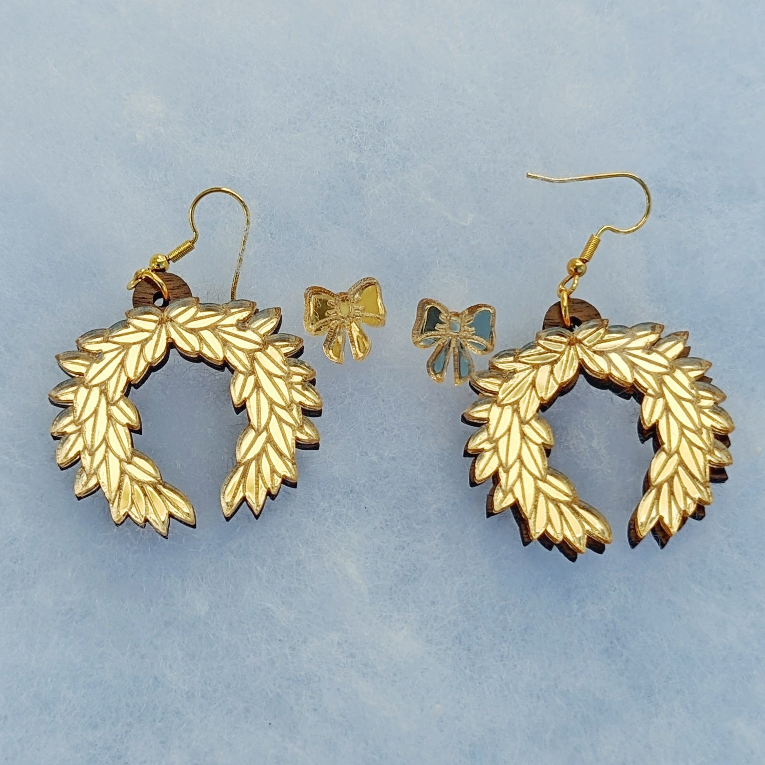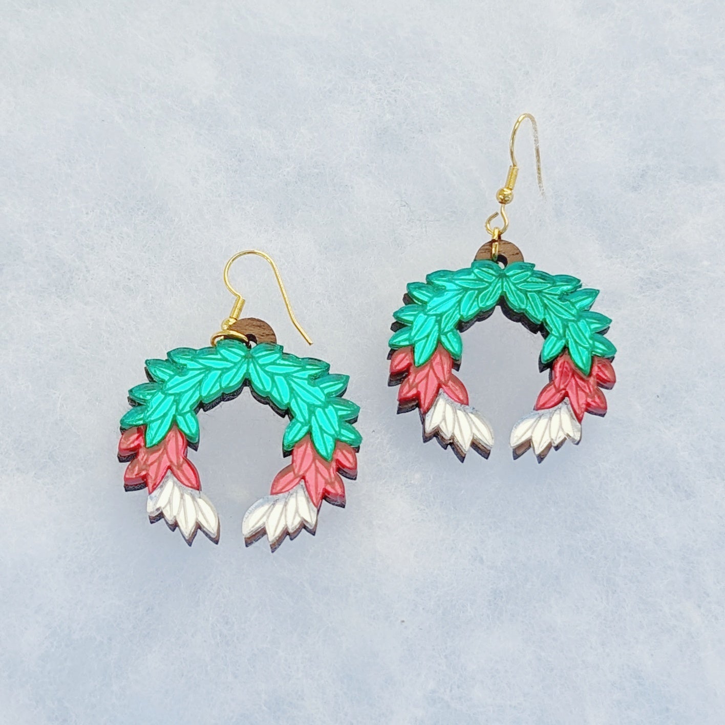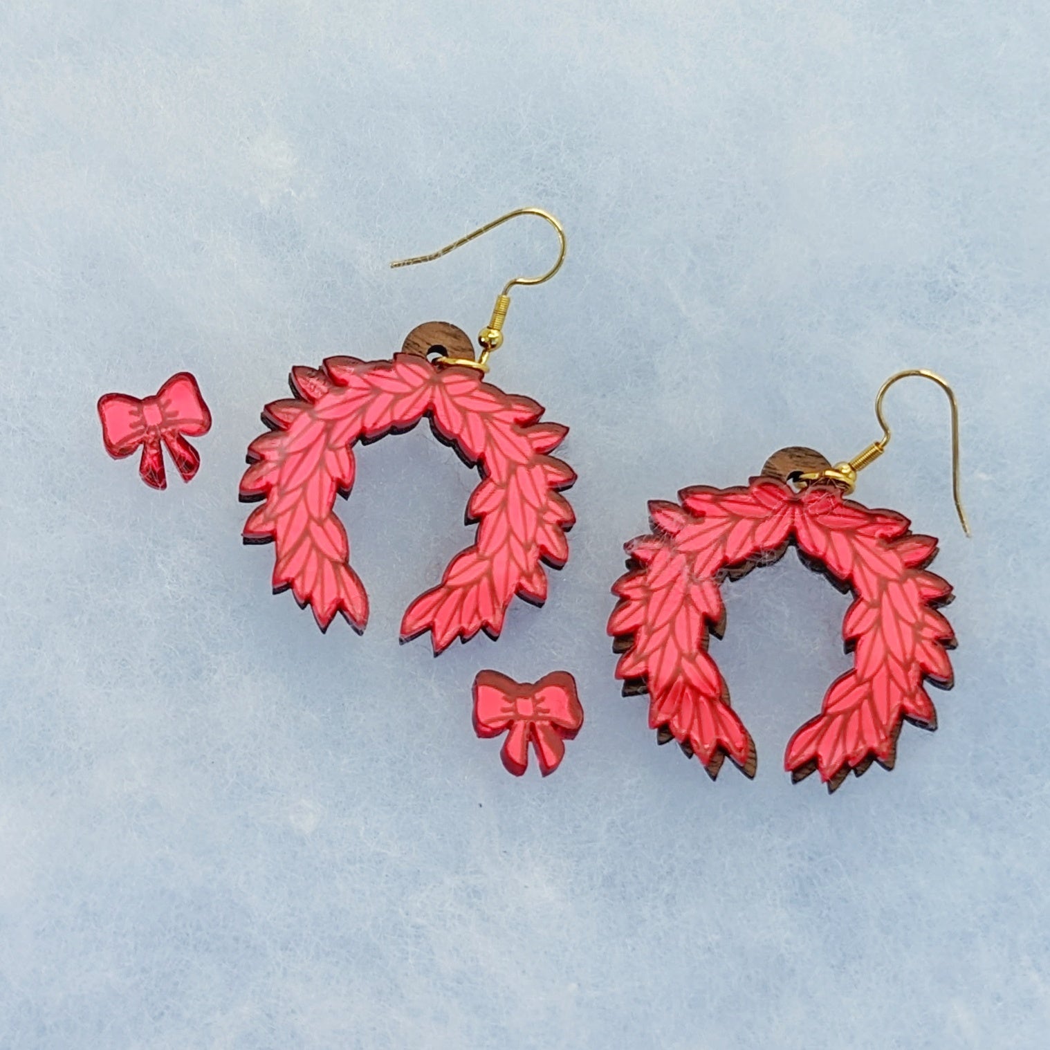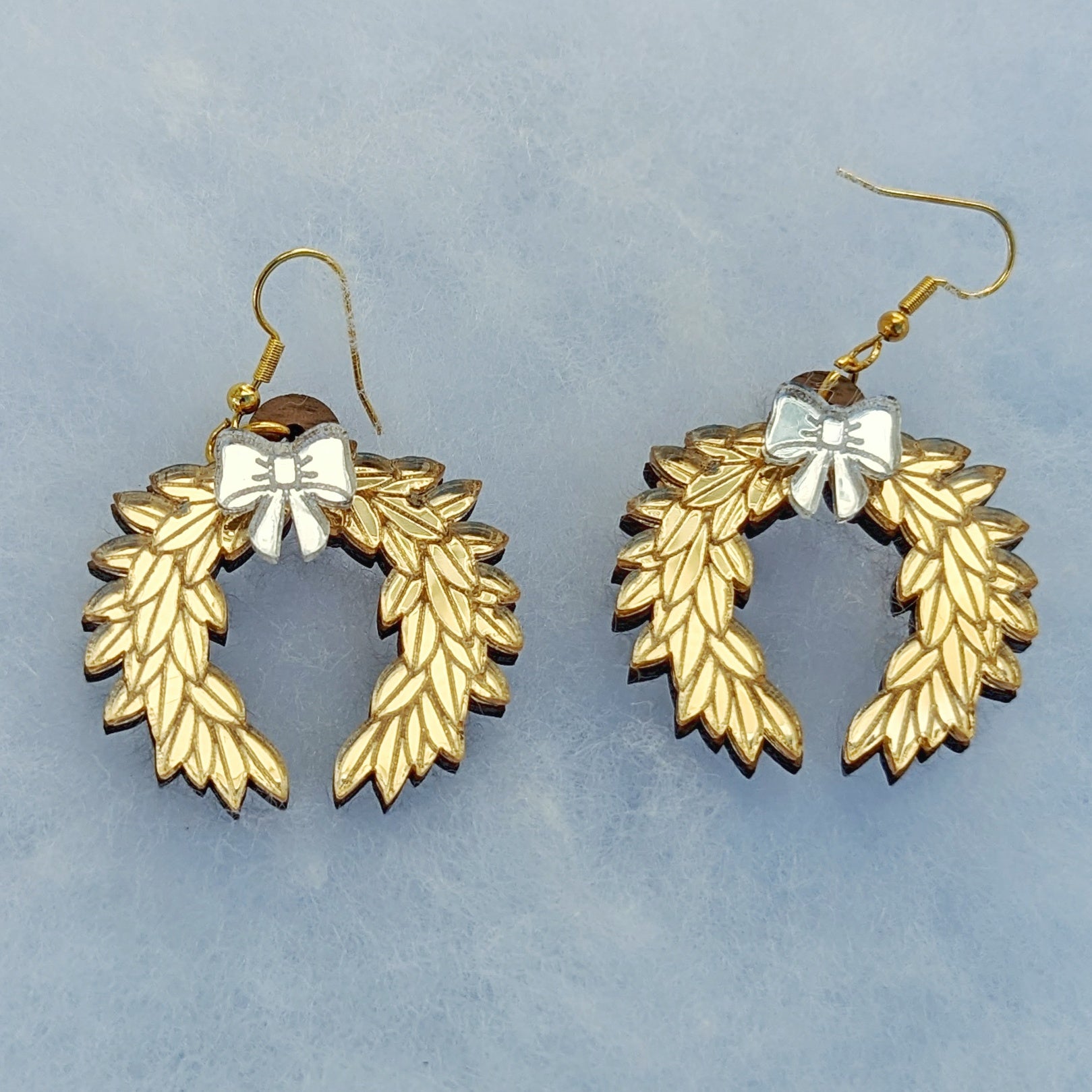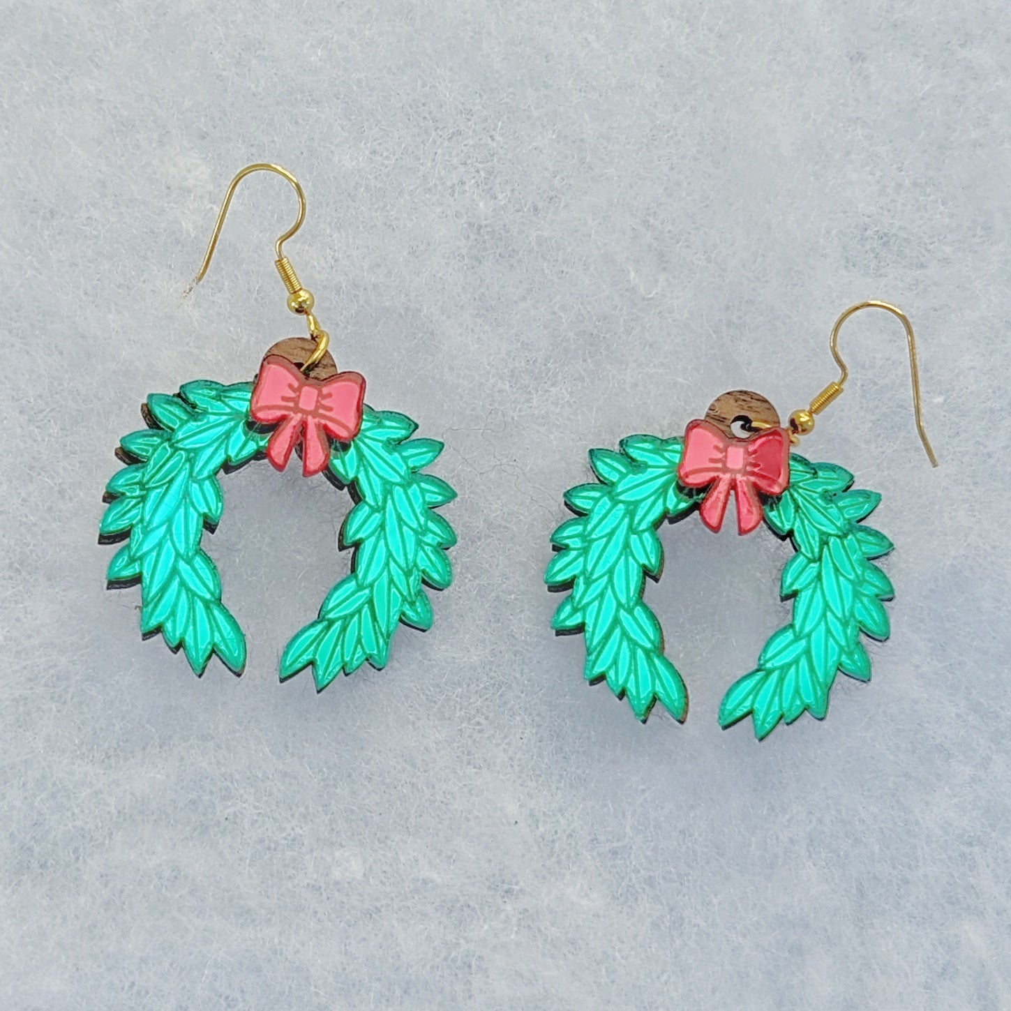 Holiday Laurel Wreath Earrings come in a variety of colors. Choose from Red, Green, Silver, Gold or Multi. Multi is a combination of Green, Red, and Silver. Get the wreaths by themselves or choose to have a bow of any color. These earrings are shiny and reflective to add a little extra sparkle to your life.