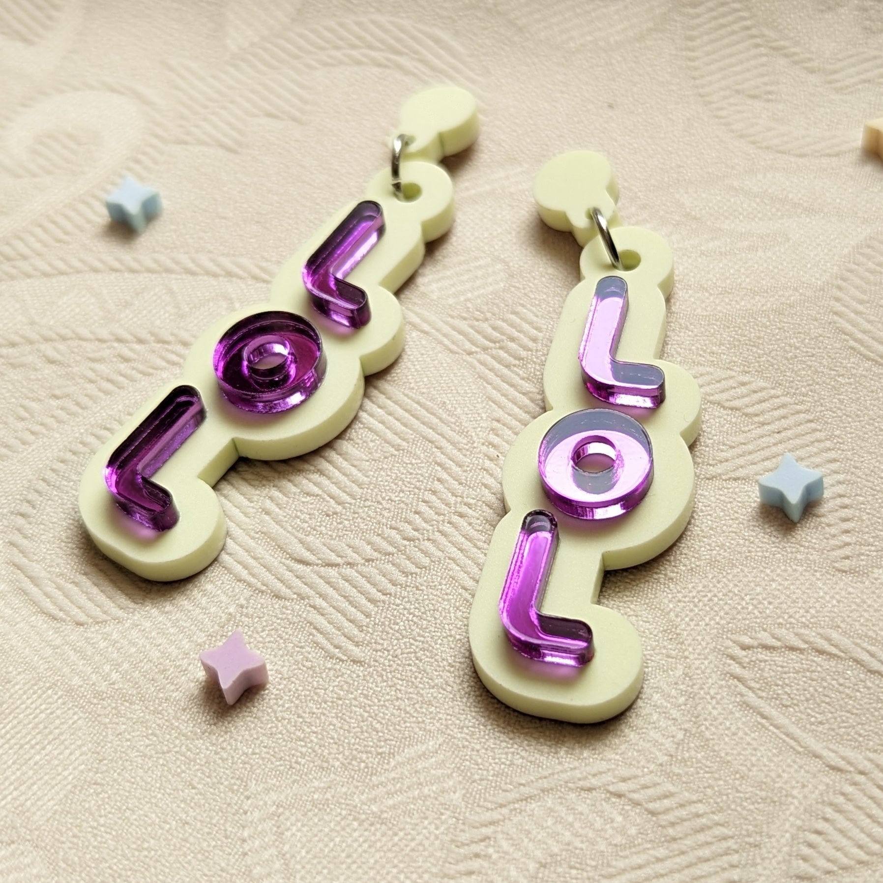 "LoL" Acrylic Earrings! Unique handmade pastel yellow and purple dangle earrings. They are made with high-quality shiny mirror and matte acrylic to add a pop of fun to any outfit.