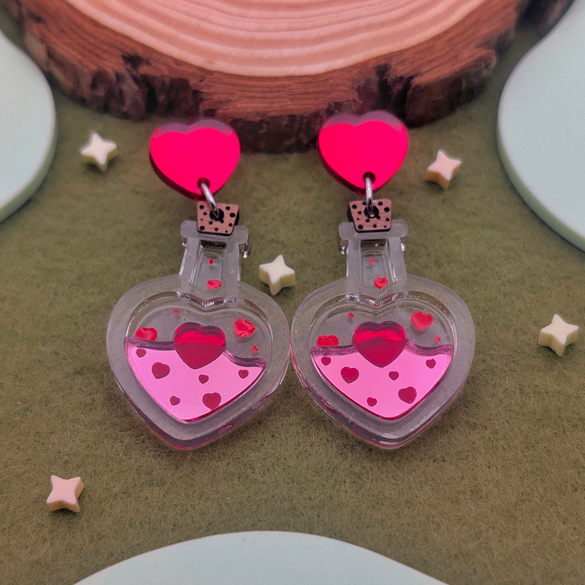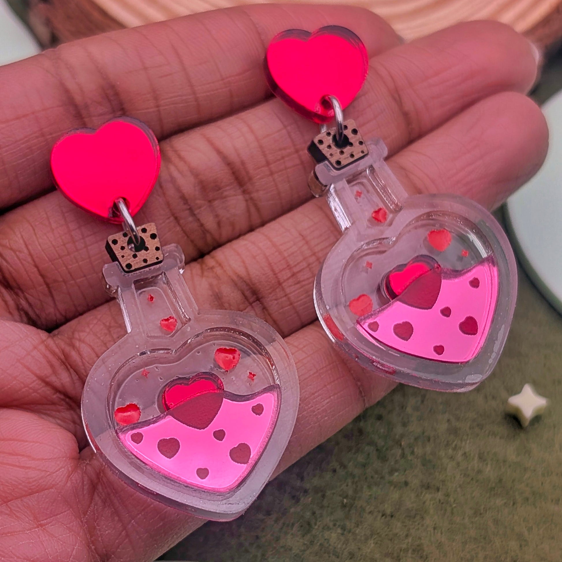 Cute pink Love Potion earrings in heart-shaped bottles.