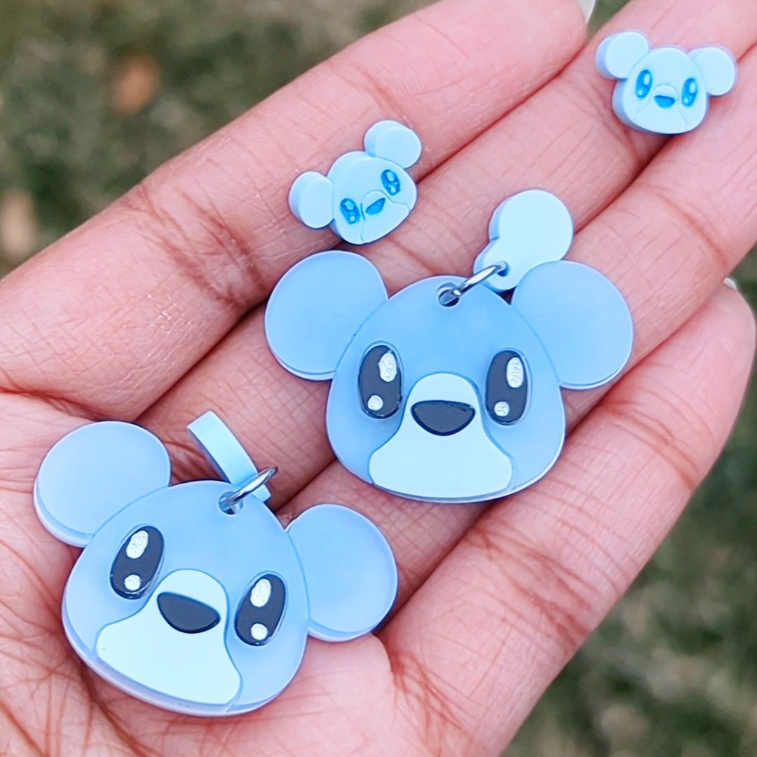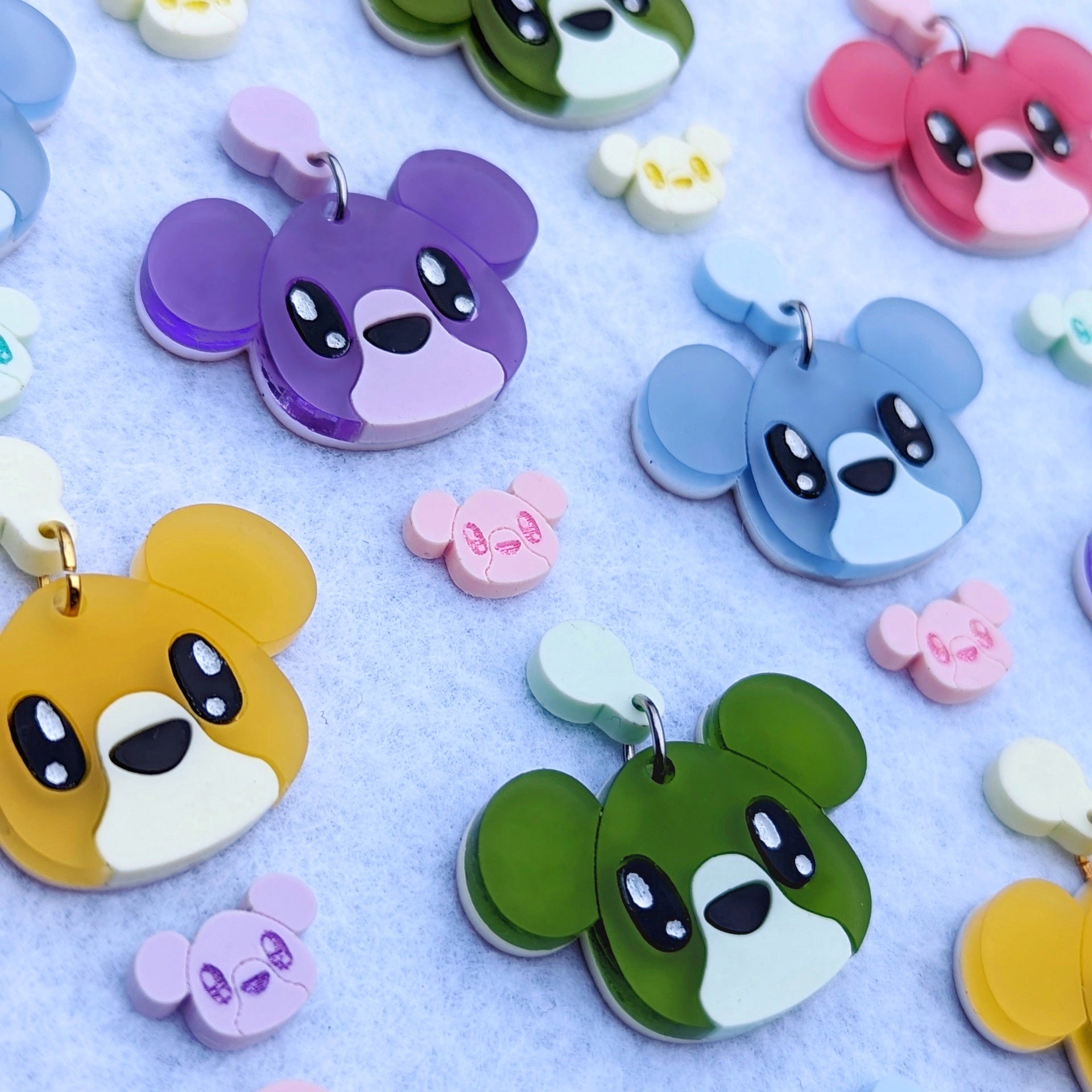 Adorable pastel bears in blue, green, purple, pink, and yellow. These are cute matte earrings with frosted and opaque matte pastels. The eyes and nose are black with engraved white details. Mini studs are small with only 1 layer of acrylic and painted features. Each choice comes as 1 pair.