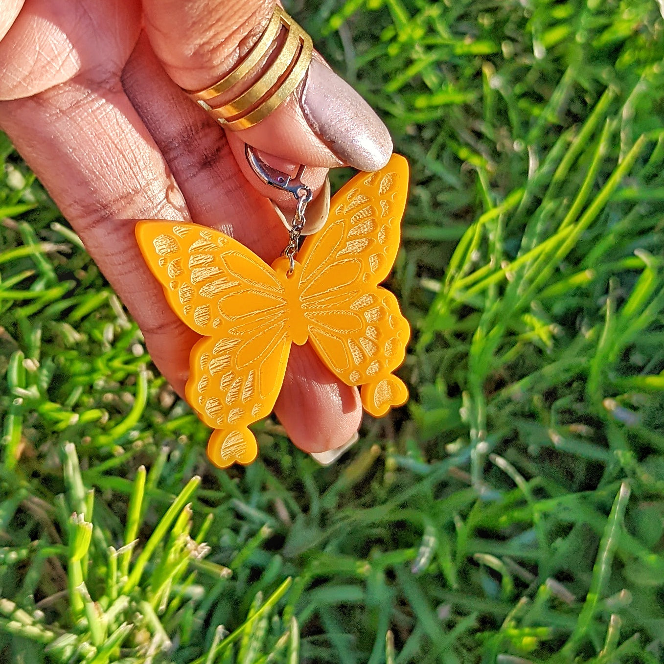 Apricot Butterfly Earrings with hearts. They are a pastel orange color perfect for spring and summer.