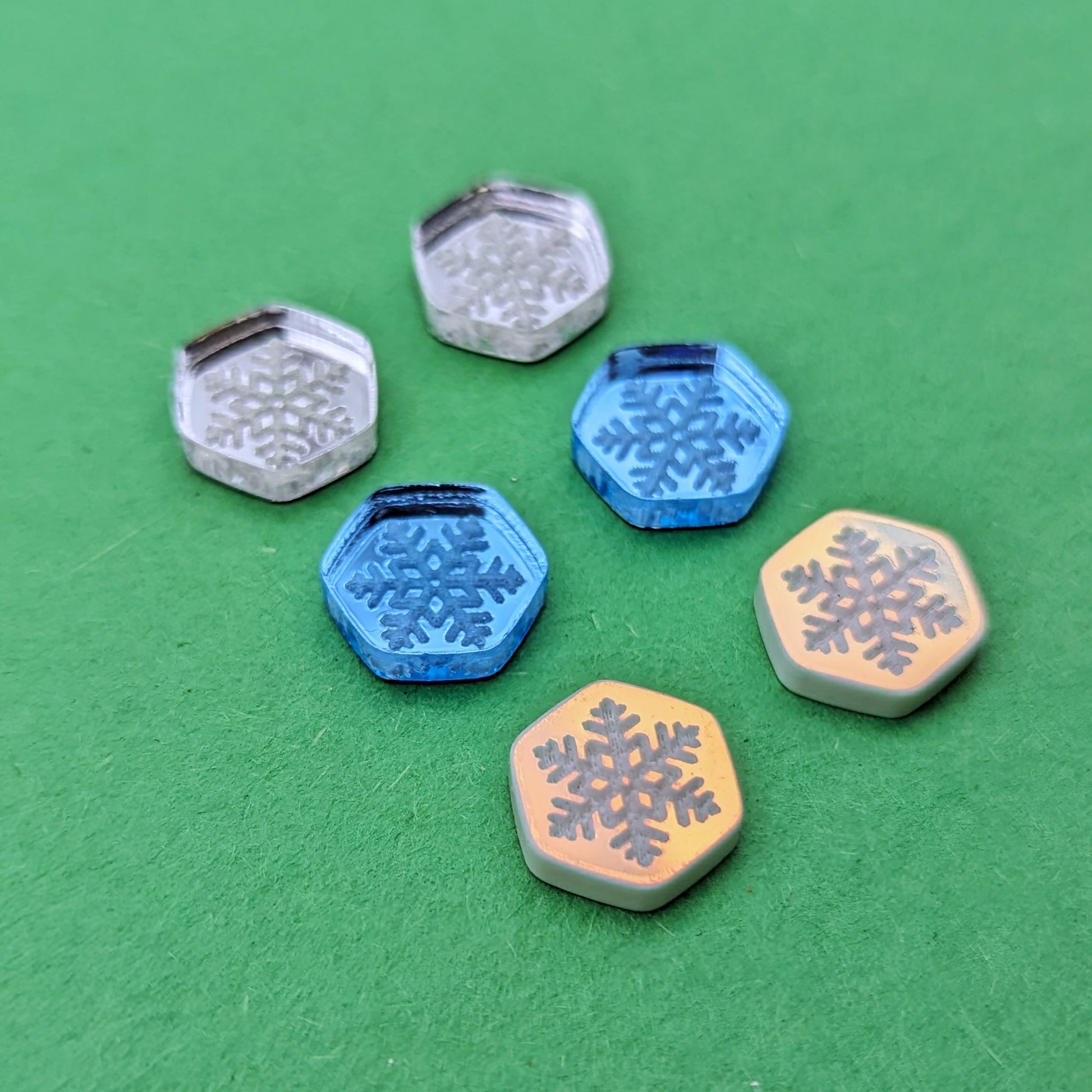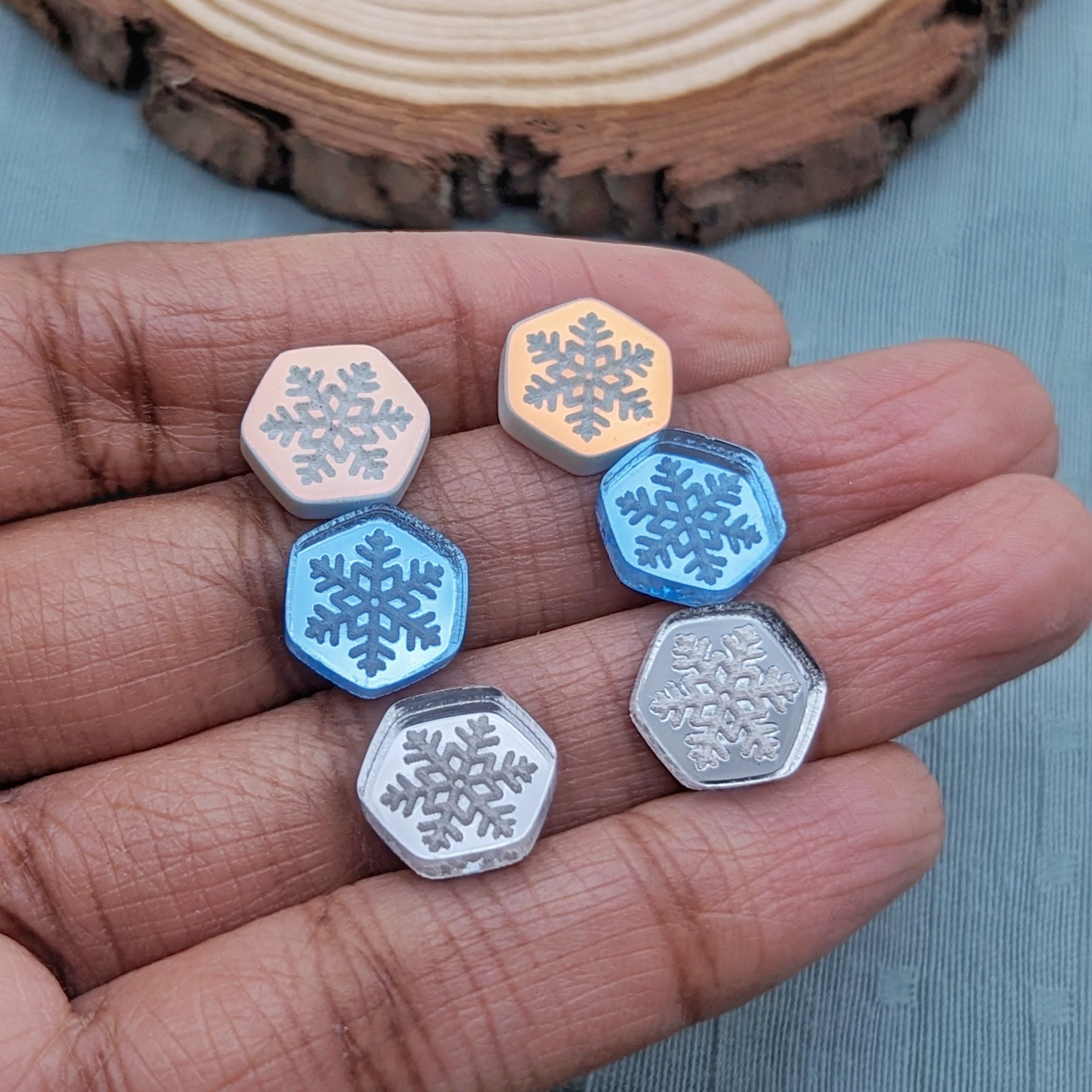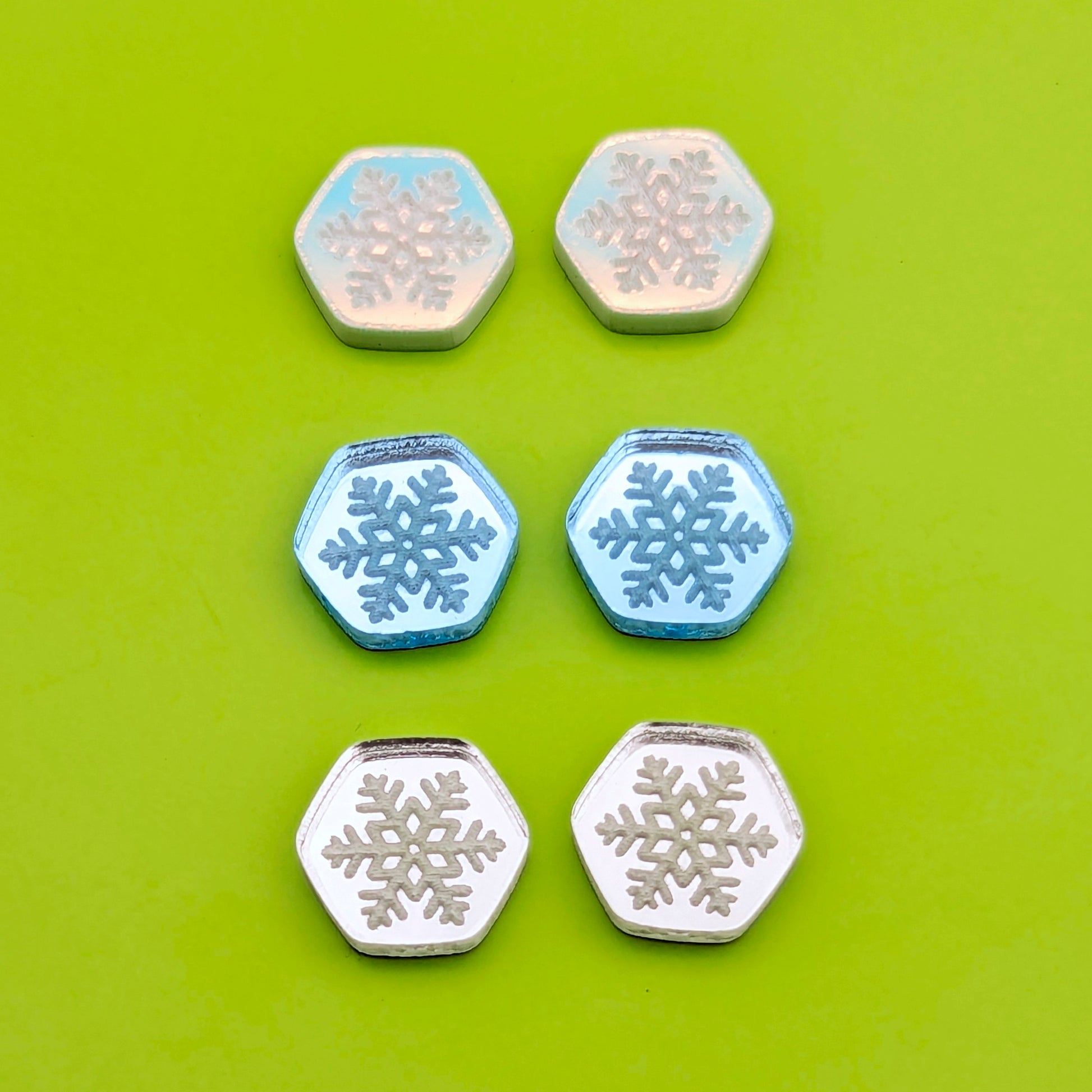 Hexagon stud acrylic earrings with an engraved snowflake design. They are available in Silver, Ice Blue, and Iridescent.