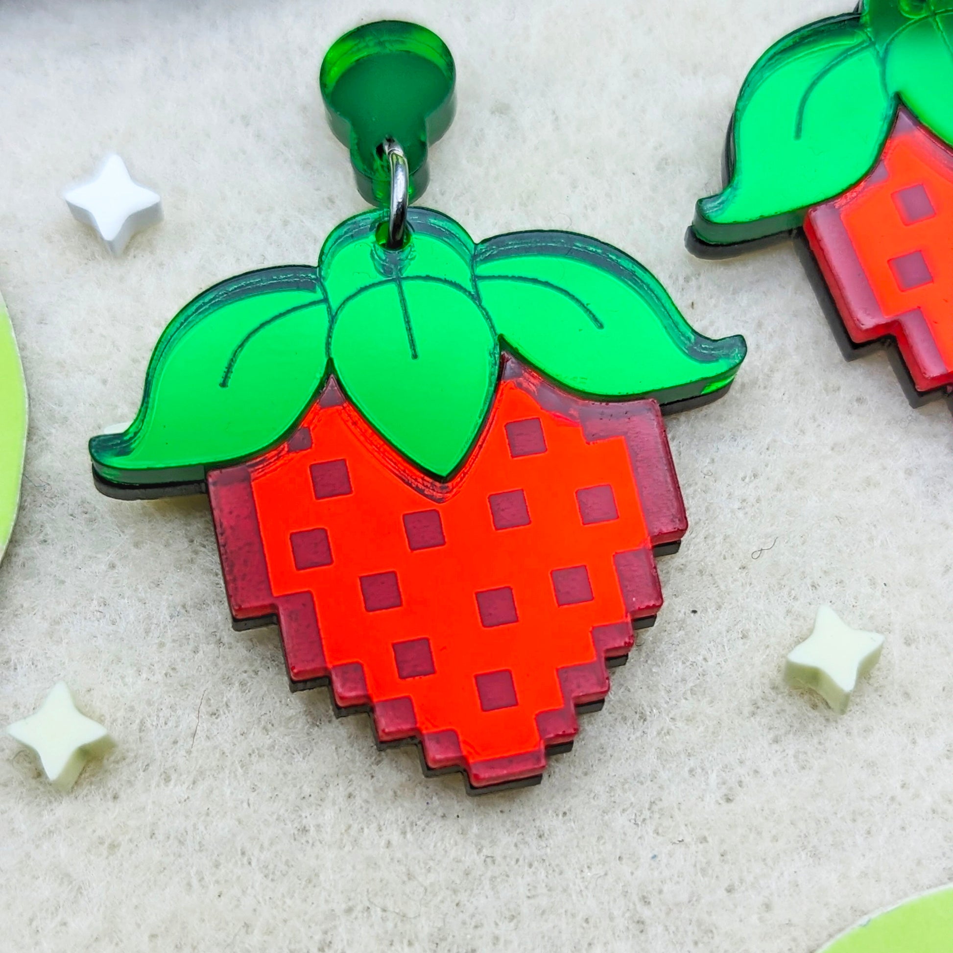 Handmade Strawberry earrings. They are bright red with green leaves.