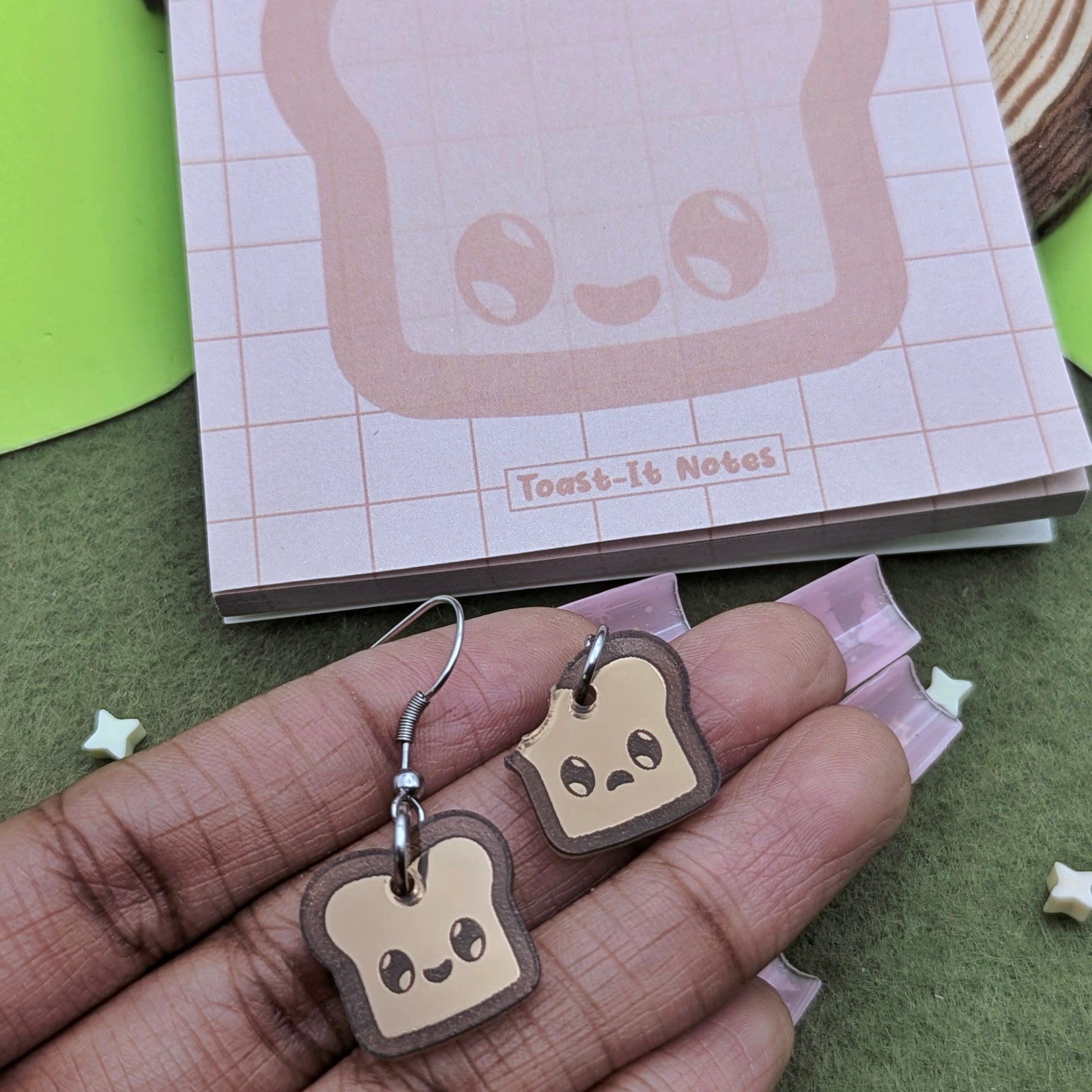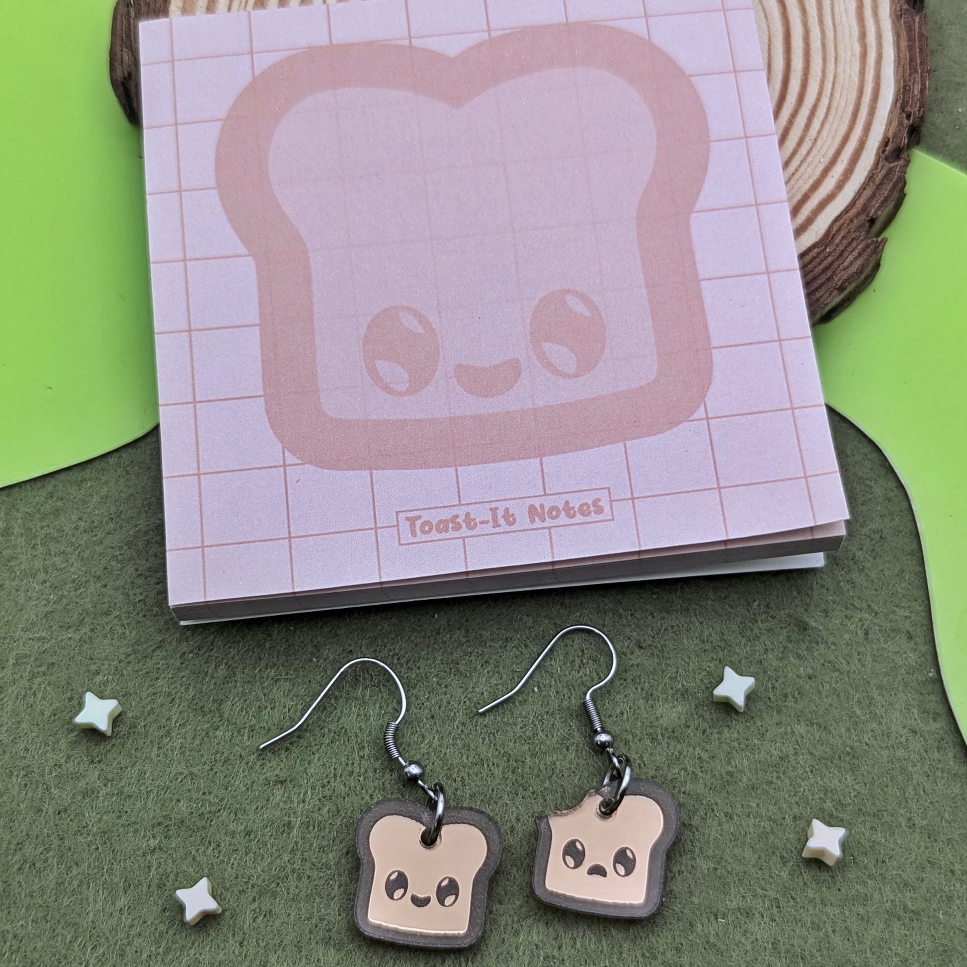 Toasty-It earring and sticky note bundle. Includes one cute Toast-It sticky note pad and one pair of Mini Toast earrings. Each note pad includes 50 sheets with adhesive backing. Choose earrings with fishhooks, leverbacks, or clip-ons.
